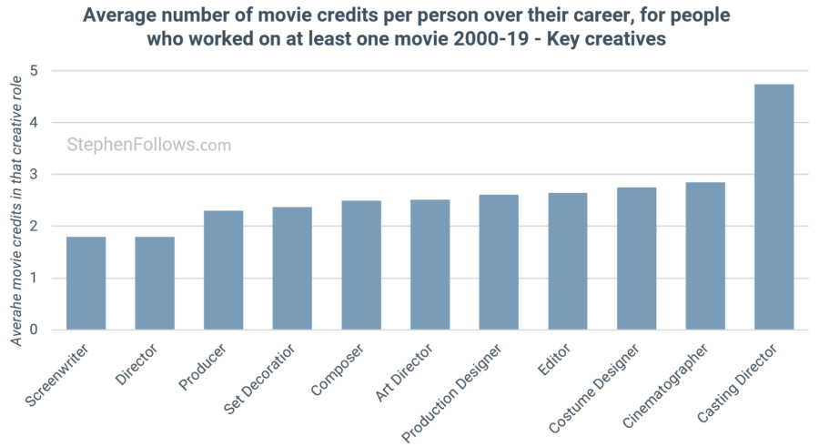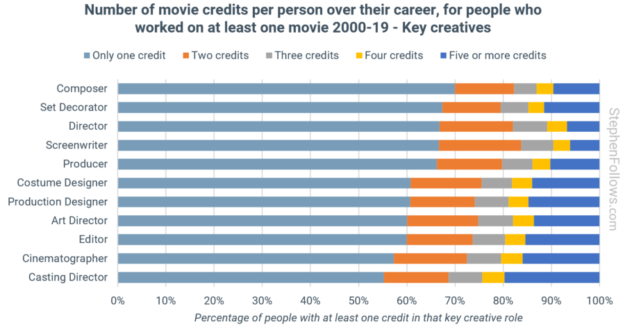 Film composers are least likely to be hired more than once, with 70% only receiving one movie credit. They're followed closely by set decorators (67%), directors (67%), writers (67%) and producers (66%). Casting directors have the highest levels of recidivism, but even they have a 55% one-and-done rate.
