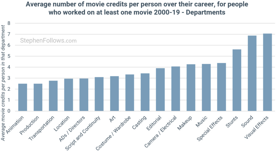 Crew members in the visual effects department have the greatest number of credits per person (7.1) This is measuring publicly declared credits so I suspect the real number is slightly higher, given that studios are notoriously patchy in ensuring that everyone who worked on a movie's visual effects receives a name check.