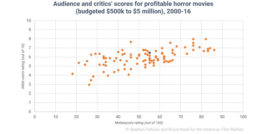 That blue dot (6.4 IMDb users score and 55 Metascore) represents the average for all movies released in US cinemas. This shows that more than half of the profitable horror movies in this study are worse than the average of all movies, further underlining how weak the correlation is between quality and profitability for horror movies. Even profitable horror movies were considered, on average, to be mediocre by critics and audiences alike.