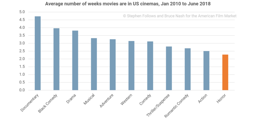 And secondly, it’s not all rosy. The profitability and production figures hide a risky aspect to horror films. While profitable horror films are common, so too are horror films incurring big losses. This can be seen in how long movies of each genre stay available to the public in cinemas. On average, documentaries stay in theatres for almost 5 weeks, whereas horror movies are gone in half that time.