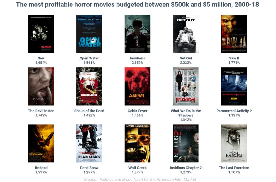 The good news is that horror is a genre which reliably produces hit movies, often on very modest budgets. In fact, measured purely in terms of profit, horror is the best genre in the industry.