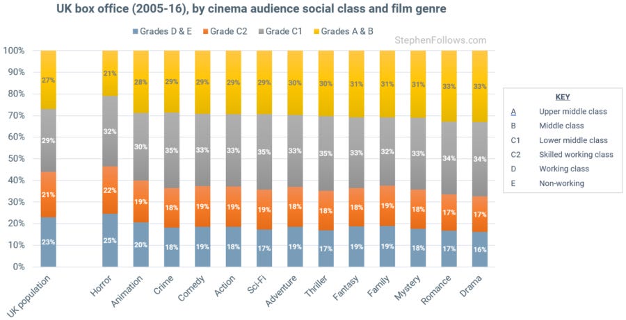 Using exit polls of UK cinema audiences, we can see that horror movies are disproportionately enjoyed by people on the lower end of the class spectrum when compared to all other genres. Only 21% of people watching horror movies are in the top two class brackets (i.e. “A” and “B”) whereas it’s 33% for dramas.