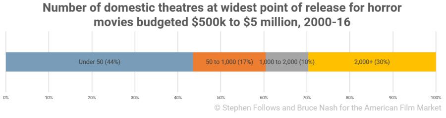 If your film gets picked up for a domestic theatrical release then it’s likely to get one of two releases – either very wide (i.e. over 2,000 theatres) or very small (i.e. under 50 theatres). Why so few films in the middle ground? Again, this comes back to the relatively short legs for horror movies. The two successful release strategies are: