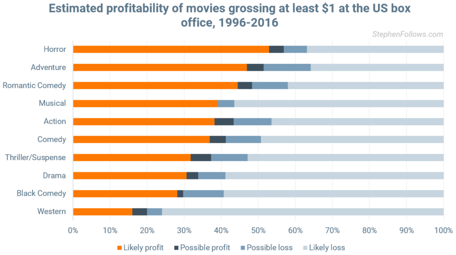 When we widen our focus and broaden our statistical model to look at all movies released, horror appears to be the most profitable of the genres. We estimate that just over half of all horror movies released in US cinemas made a profit when all costs have been taken into account. This is significantly better than dramas, of which we estimate only a third make back their total costs.