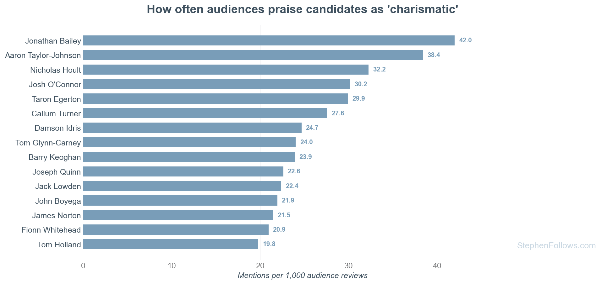The third proxy is the strongest of the three because it is the one most directly about the actor. Using the same audience review corpus, I tracked counts of mentions of the actor alongside things like “charisma”, “magnetic”, “presence”, “star quality”, “commanding”, and similar euphemisms.