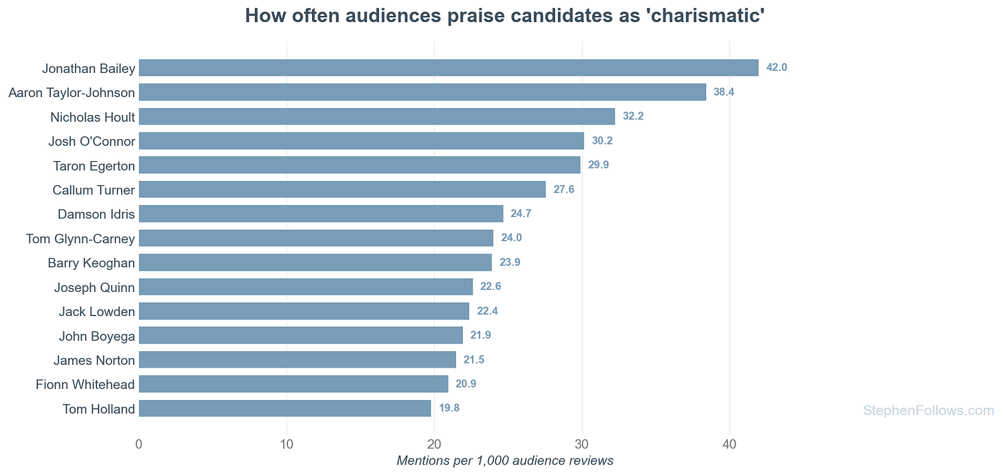 But any tweak to the criteria would massively change the order. Reweight charisma by even a few percentage points and Jonathan Bailey or Taylor-Johnson is on top. Decide that fame is a positive signal rather than a negative one, and Holland leads. Drop the British requirement, and Jacob Elordi is your Bond.