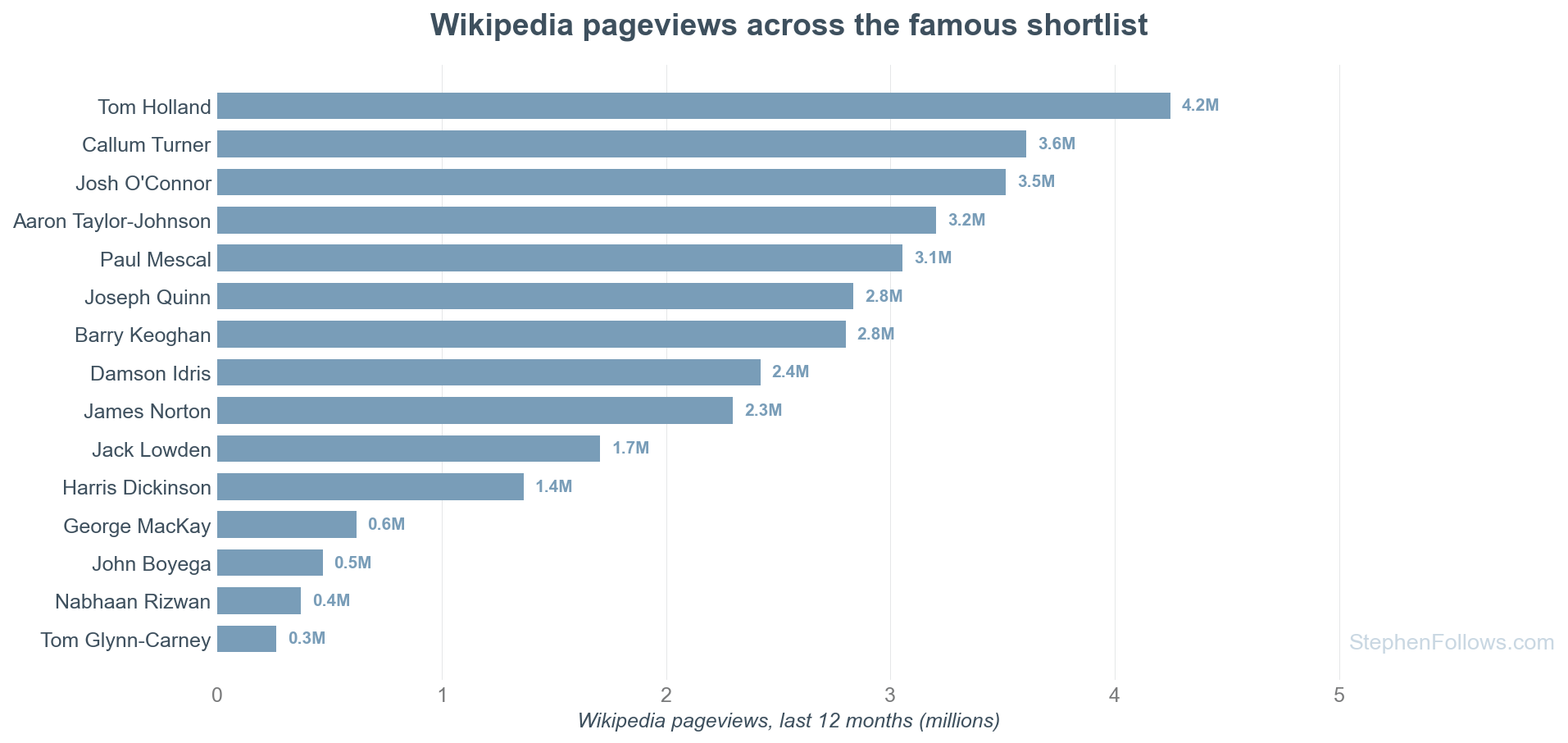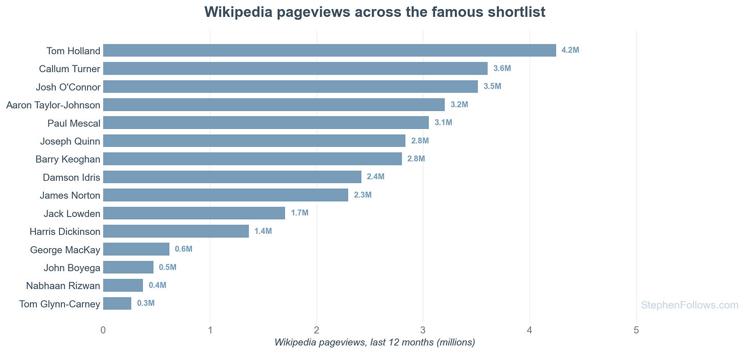 If I had to pick someone who scores well but is priced badly by the bookies, it would be Tom Glynn-Carney. 31 years old, six foot one, a graduate of Guildhall, average film Metascore 65.2 and with a Wikipedia footprint of a quarter of a million pageviews (so known but a tenth of Tom Holland’s numbers). He has the shape of every Broccoli-era casting decision the producers have made.