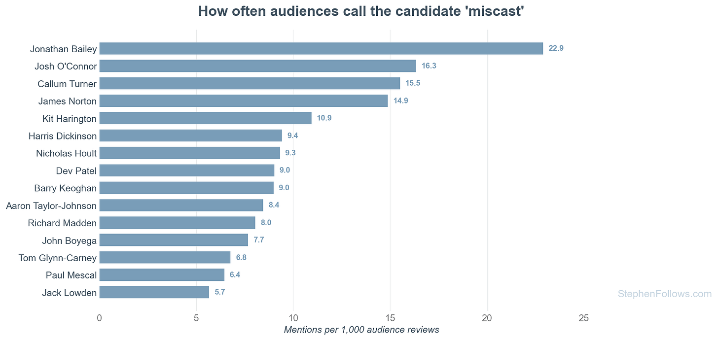 Another signal we might look at is how well the actor has convinced the public in their previous roles. I pulled audience reviews and tracked mentions of “miscast”, “wrong for the role”, “unconvincing”, “didn’t fit” with each actor.