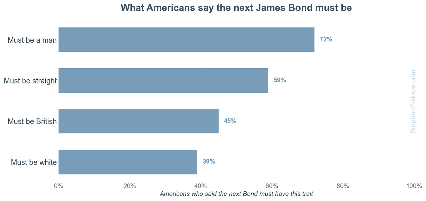 It’s not clear to what extent Amazon agrees, but the vast majority of the public does. A YouGov poll from 2023 asked Americans which traits a future Bond must have.