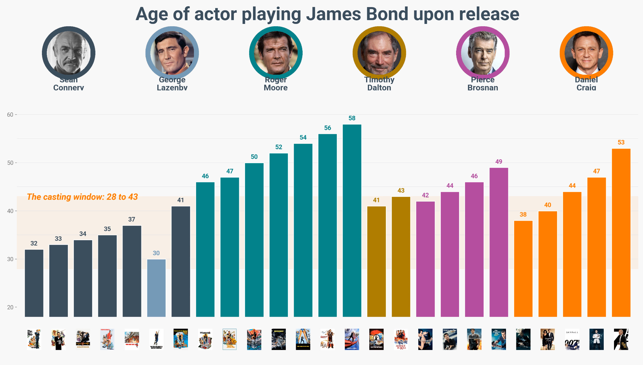 The two most commercially successful Bonds were the youngest at debut. Connery had a nine-year run from 32. Craig ran from 38 to 53 across five films and $3.97 billion in box office. Moore made seven films but was visibly ageing out by the end.