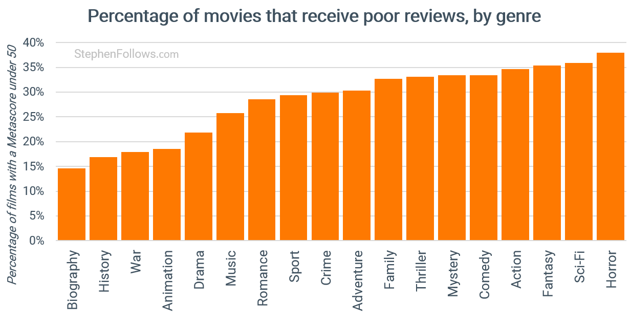 Across the dataset, critics rarely give poor reviews of biographies, historical films, and war films. This is obviously a highly interconnected set of films, as films can have multiple genres applied, and there is a lot of overlap among those classifications.