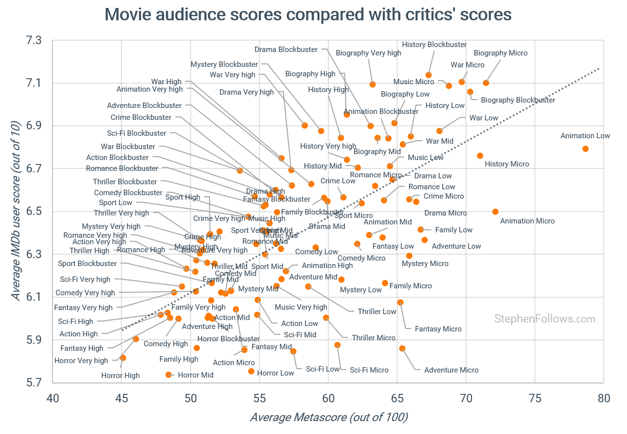 When we bring in audience scores (presented here by the IMDb user score), we can see that while audiences and critics do broadly agree, there are many cases of misalignment.