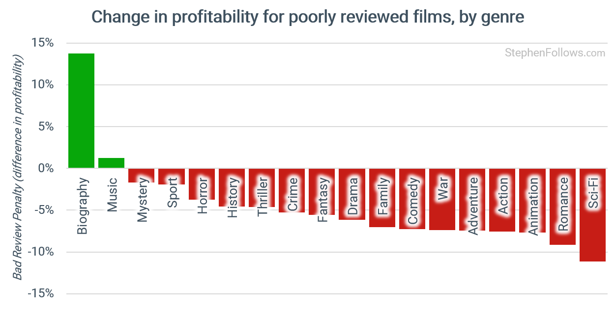 To understand which types of films are least affected by weak reviews, I created the “Bad Review Penalty”, which is a simple measure of the connection between critical reception and profitability.