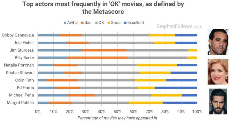 Perhaps as a consequence of this search for adequate movies, you're less likely to have heard of the names of the 'OK' lists. Film critics are most apathetic about movies starring Bobby Cannavale and Isla Fisher - both actors who may be better known to fans for their TV work than their movie careers.