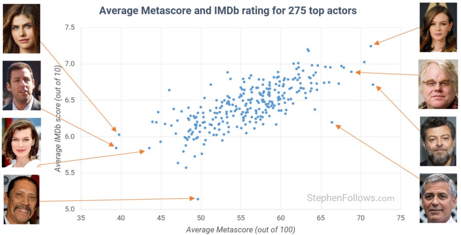 As you can see from the scatter plot below, the two groups broadly agree - if critics like movies starring a certain actor then there's a good chance that film audiences will too.