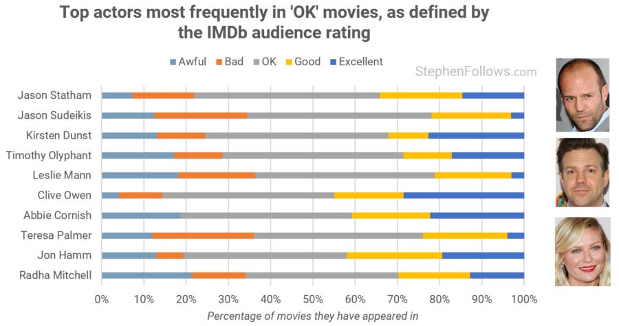 I'm glad you asked. I also looked at the actors who most commonly appear in movies which are best described as "Ok, I guess". The cinematic equivalent of a shrug.