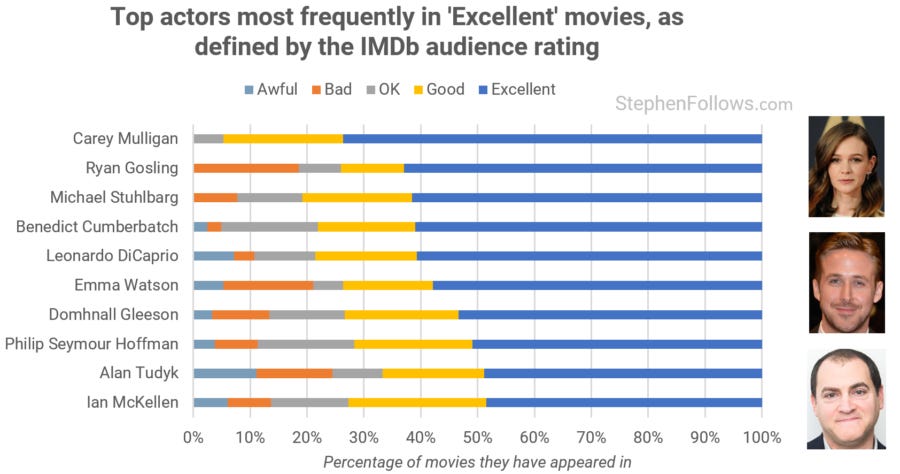 If you prefer audience ratings over those of film critics then you may want to look out for movies starring Ryan Gosling, Michael Stuhlbarg, Benedict Cumberbatch, Leonardo DiCaprio or Emma Watson.