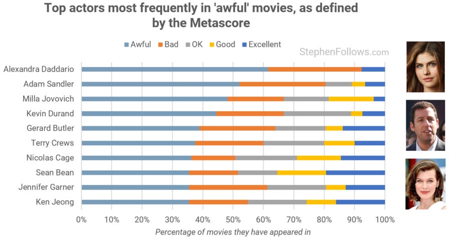 And at the other end of the spectrum, we have actors who are frequently cast in worst-rated movies. Critics dread seeing Alexandra Daddario, Adam Sandler, Milla Jovovich, Kevin Durand and Gerard Butler.