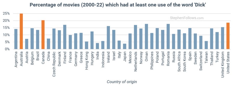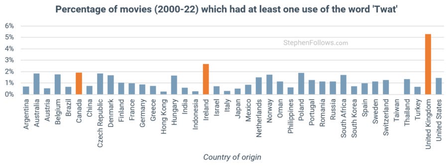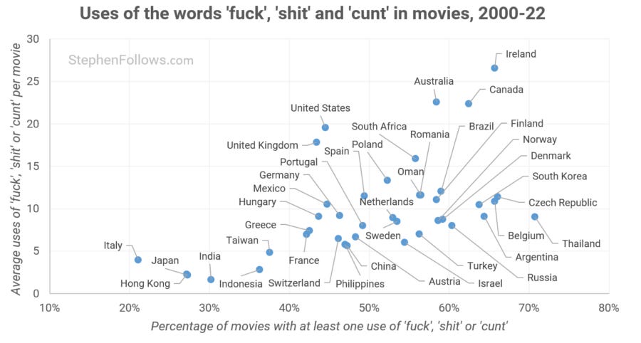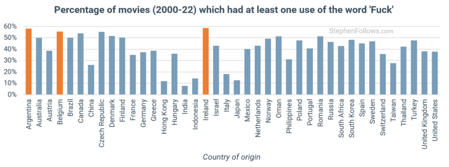 Very interesting topic to analyse. I’d see how challenging it is to reflect the real number of swear languages used in non-English films though. As a HongKong-native I do sometimes pay attention to the subtitles when watching our local films. What I often discover is those subtitles don’t often translate the swear languages mentioned. This may likely affect the calculations, as Cantonese swearing language is far more colourful than the three words included here for the study and used as almost like part of a casual conversation. Hence it’s a bit hard to imagine how “civilised” HK films are reflected in this study. Much appreciate the effort though. Would be truly interesting if someone else can truly analyse the frequency and density.