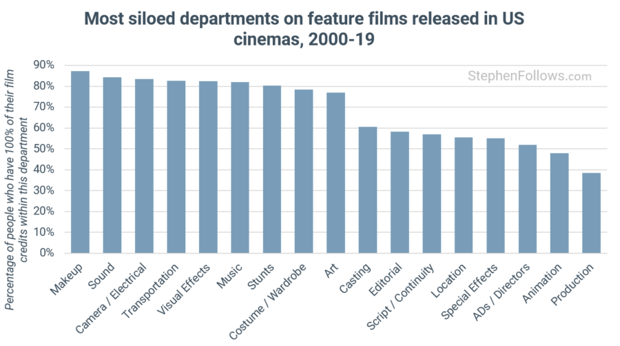 At the other end of spectrum, the Production department has the lowest silo rate, with just 39% of people working exclusively within Production across their film careers.