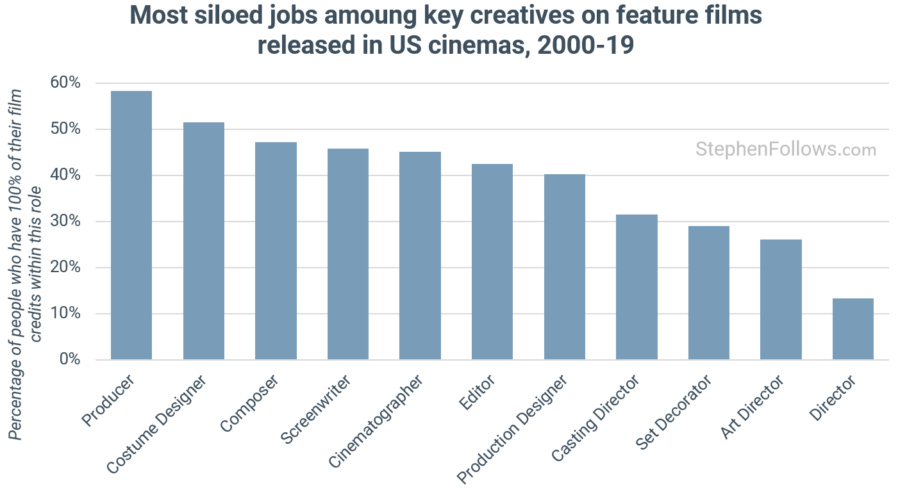 Moving on to the key creative roles, we see an interesting flip, in which Producers are the least likely to be credited in other creative roles. 58% of Producers never receive a film credit in another role. Similarly siloed creative jobs include Costume Designer (52%), Composer (47%) and Screenwriters (46%).