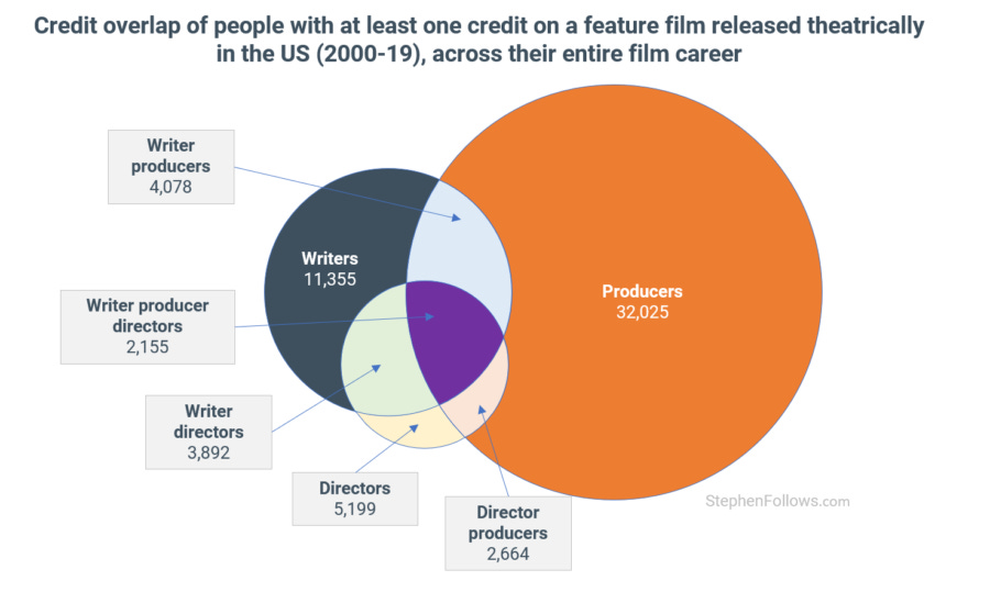 This is born out in previous research I carried out into the overlap of key roles. You can read the full piece here but I thought it would be useful to include the pie chart below, highlighting the extent to which directors frequently also take on the roles of Screenwriter and Producer.