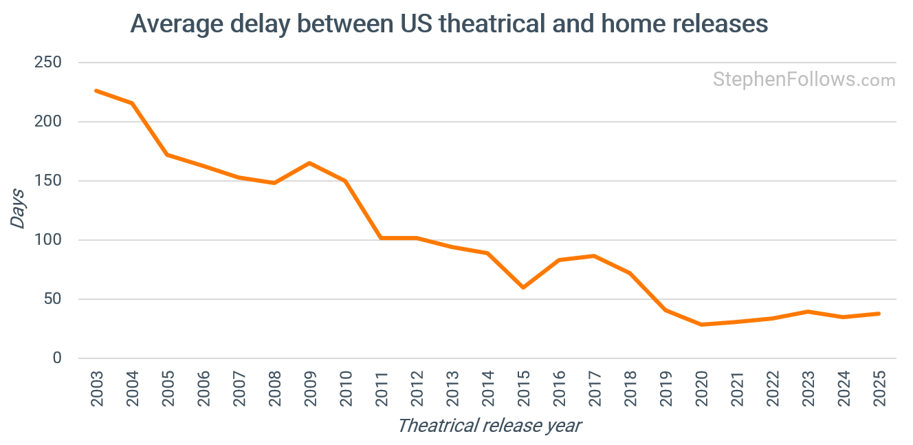 I’m currently working on a longer deep dive focused on release windows, but I can share that consumers’ assumptions are pretty spot-on. Over the past few years, the average movie has moved from US cinemas to US homes in around 37 days. Half of what it was pre-pandemic and a sixth of the figure in the early 2000s.
