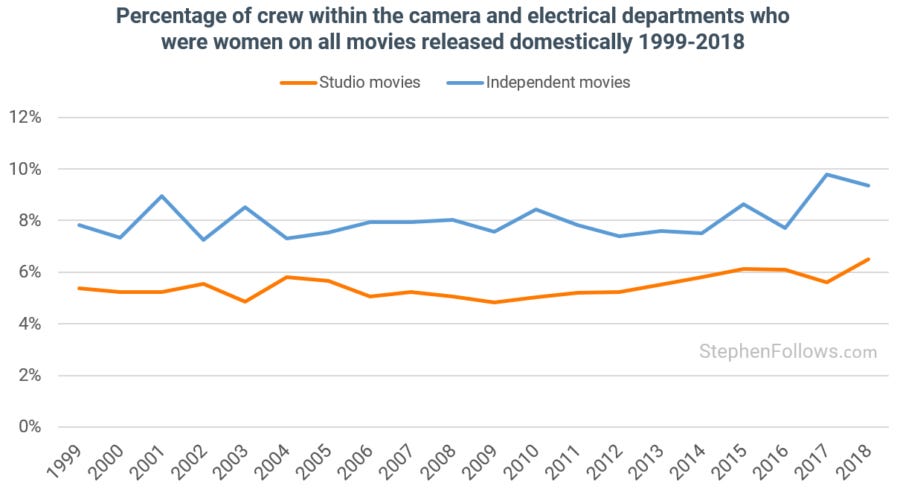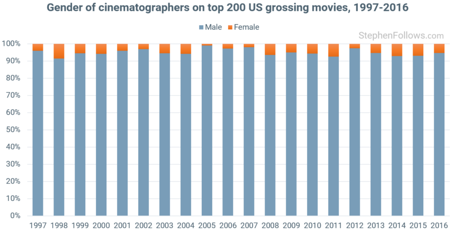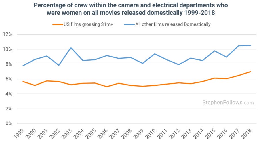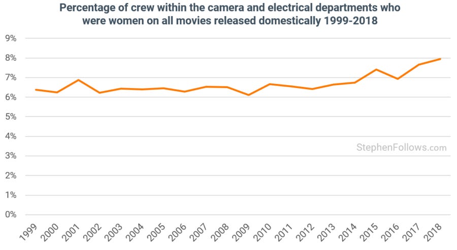 The camera and electrical department includes grips but not Directors of Photography. I studied the gender of DOPs a couple of years ago when I found that over the past twenty years just 4% were female.