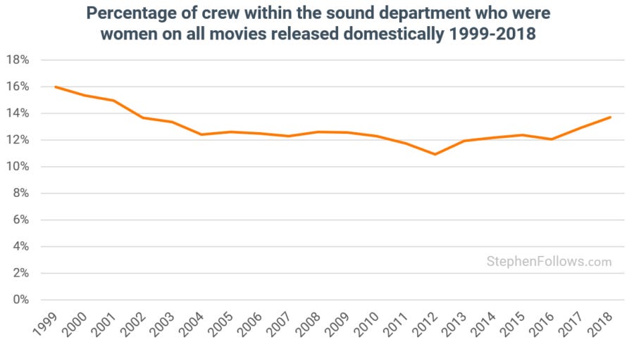 The reverse is true for the sound department. Between 1999 and 2012, representation dropped from 16.0% in 1999 to 10.9% in 2012. Since then we've seen an uptick, with the figure standing at 13.7% in 2018.