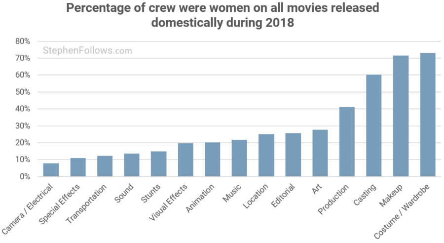 Of the fifteen departments I looked at, only three had a plurality of women - casting (60% of crew members were women), make-up (72%) and costume (73%). At the other end of the spectrum were transportation (12%), special effects (11%) and camera/electrical (8%).