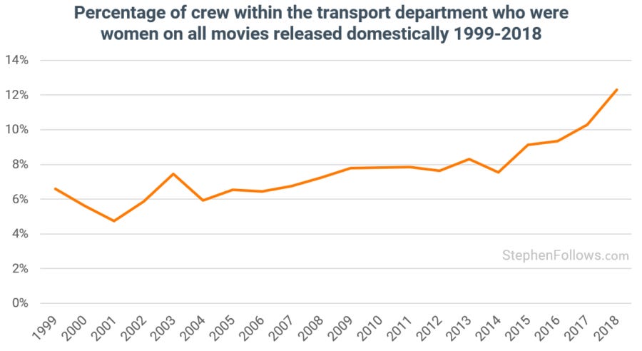 The transport department has seen a significant increase, more than doubling representation (albeit from a low starting point). The worst year in the past two decades was 2001 in which 4.7% of the transport crew were women whereas the best year was 2018 at 12.3%.